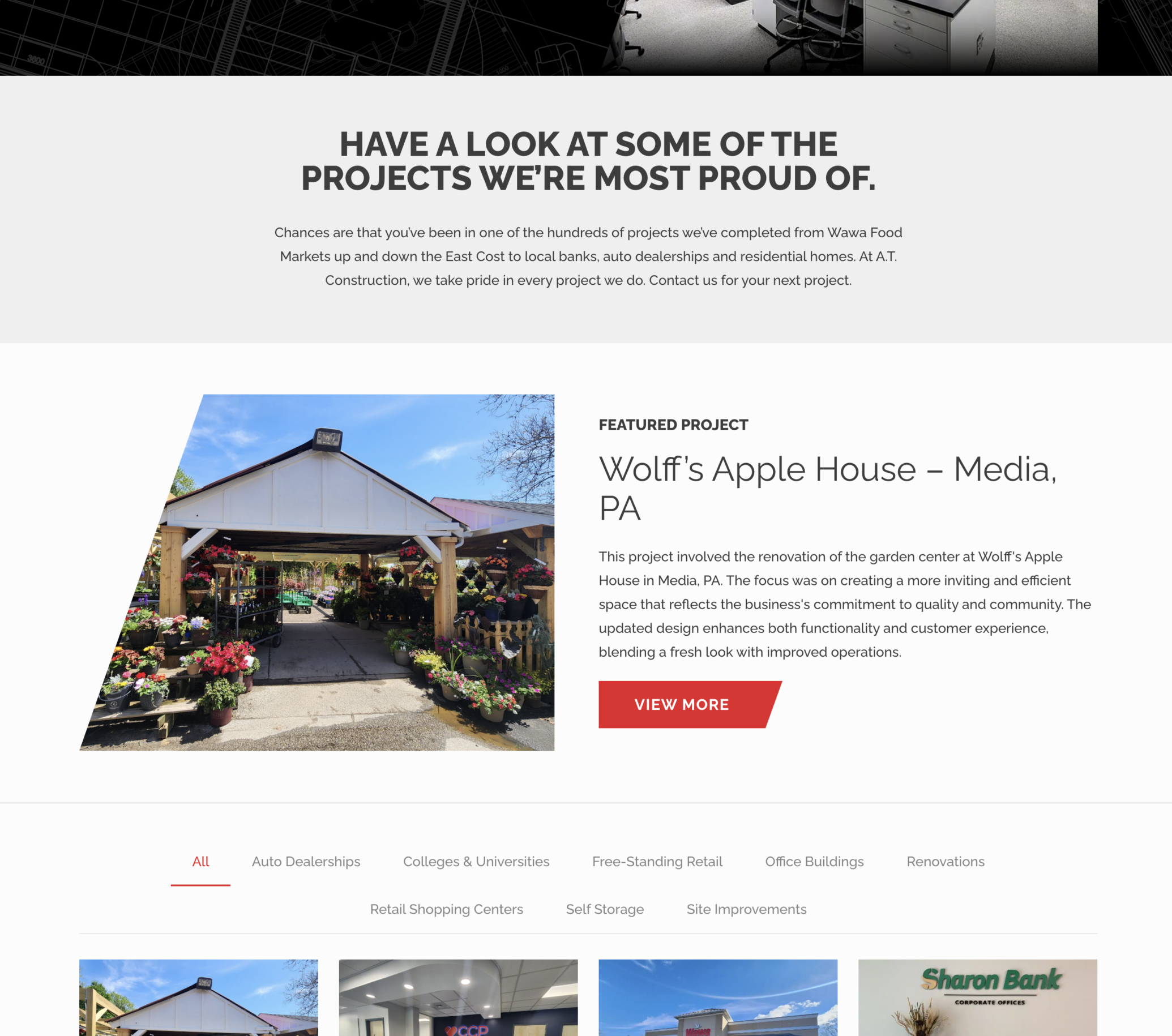 The site was launched by migrating it from our development environment to production. AT Construction remained on as a hosting and maintenance client, allowing for a smooth transition and ongoing support. Post-launch efforts focused primarily on adding completed projects that had already been queued for inclusion.
