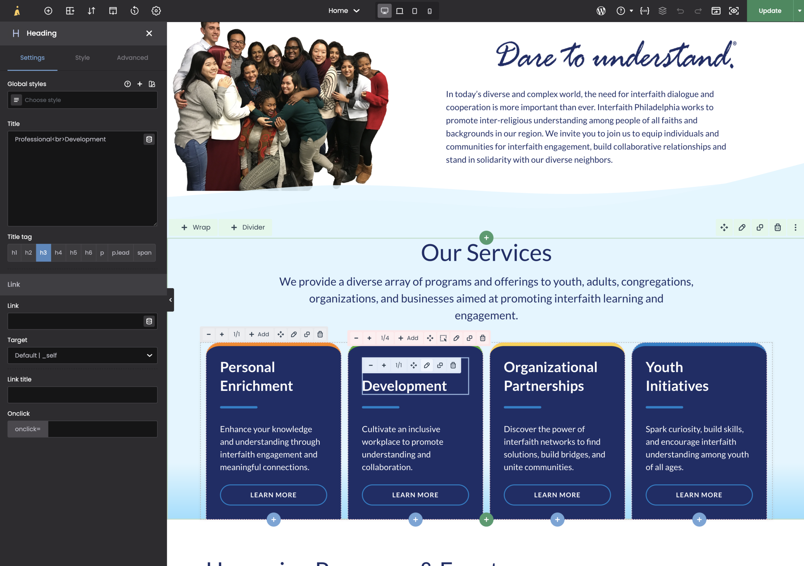 Interfaith Philadelphia approached us after finding our work through Google, specifically looking to partner with a local team. They had an established digital presence with a large amount of content, but over time the site had become difficult to manage and increasingly disorganized.